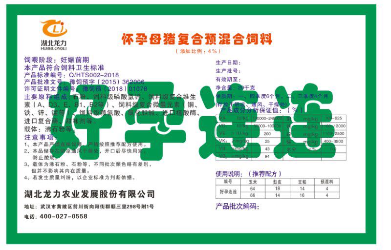 湖北龍力農(nóng)業(yè)發(fā)展股份有限公司坐落于武漢市黃陂區(qū)前川街向陽(yáng)街群順三里298號(hào)附1號(hào)。公司成立于2014年6月,公司自成立以來把“創(chuàng)全球最大養(yǎng)豬綜合服務(wù)”為企業(yè)愿景。致力于打造教保料品牌”作為公司發(fā)展的明確目標(biāo)。公司一直致力于豬營(yíng)養(yǎng)的研究和開發(fā),積極與國(guó)內(nèi)外高校和科研機(jī)構(gòu)合作,推廣養(yǎng)豬技術(shù)、動(dòng)物營(yíng)養(yǎng)新概念,向世界農(nóng)牧企業(yè)學(xué)習(xí)與合作。公司采用國(guó)內(nèi)先進(jìn)的生產(chǎn)工藝,選擇高精度電子配料秤,高均勻度、無(wú)殘留混合機(jī)等先進(jìn)設(shè)備....